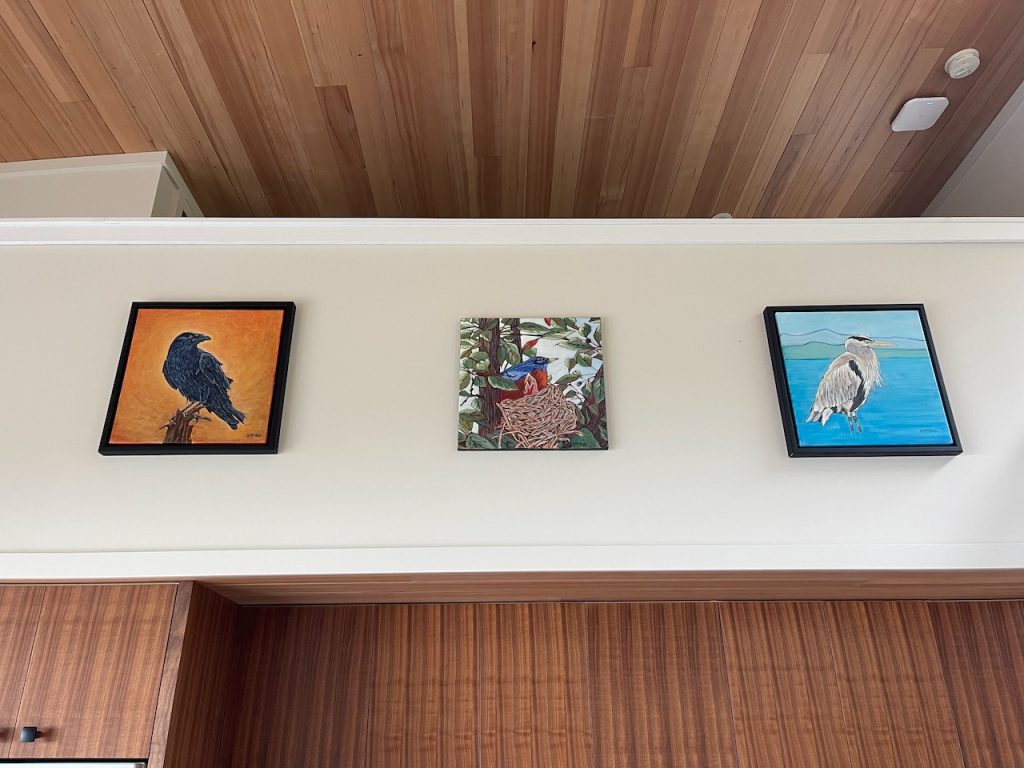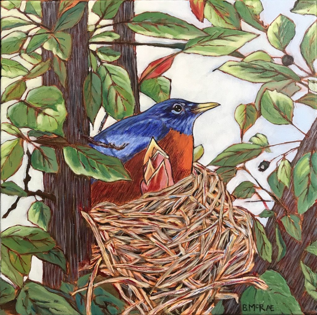Several years ago, we stopped in to visit my Maggie in her backyard in Calgary. Not only was the company great, but it was a beautiful summer afternoon with a great view of a nesting robin. I’ve been wanting to paint this scene for a while, the colours were great, but I felt intimidated by the challenge of painting the tangled nest and the light soaking through the leaves. It turned out to be a much more enjoyable process than I expected. I especially loved how the leaves turned out. I am still struggling with soft edges in this painting, but it still puts a smile on my face when I look at it hanging in my bird gallery in the Art Studio.