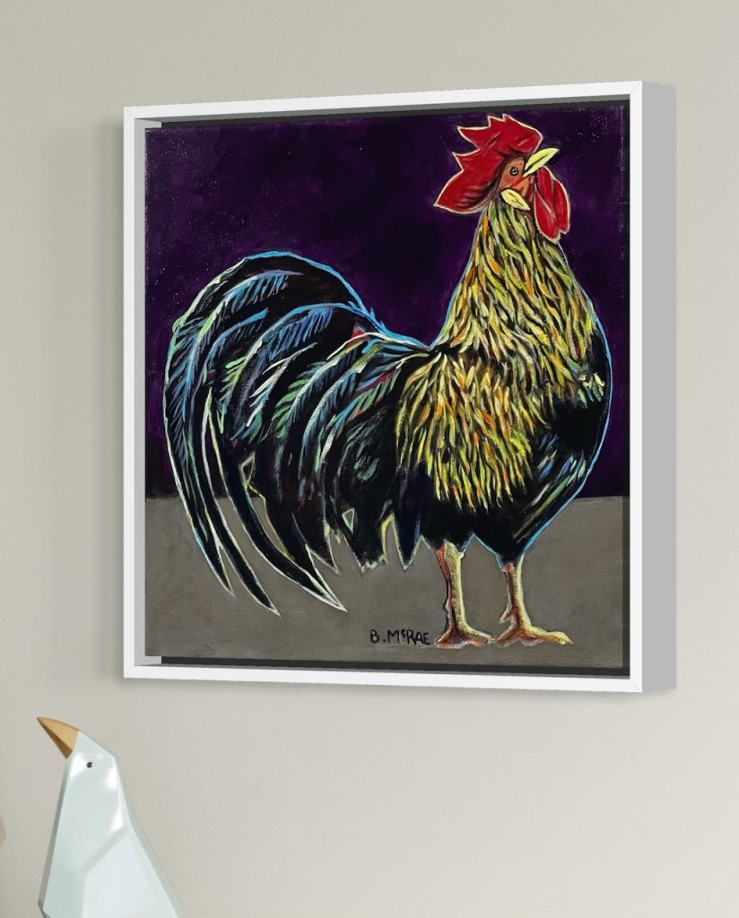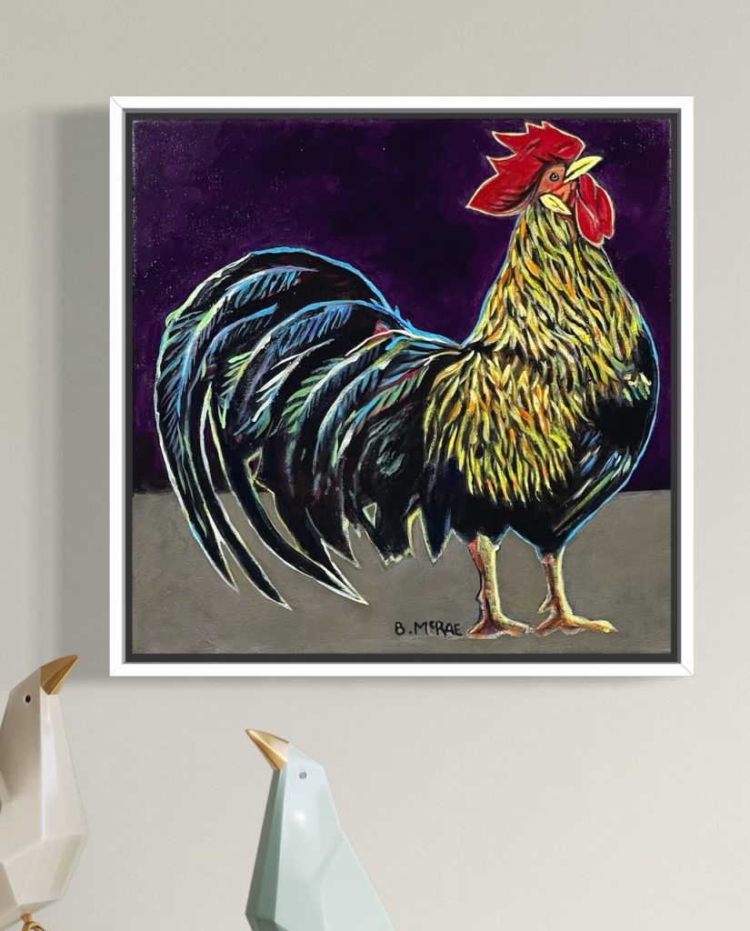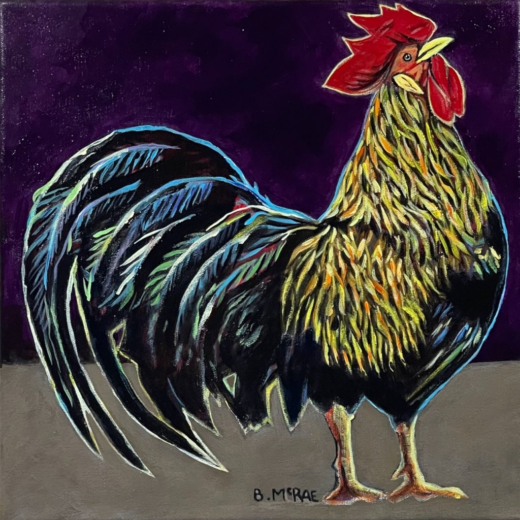 As for the subject matter, I will always enjoy painting chickens.  There is something about roosters that I find especially funny.  They seem overly confident considering that they are far down the pecking order of barnyard animals.  This extreme belief in themselves and their own inherent superiority is short lived when they are about to be flicked, swatted or stepped on.  I chose a composition that had the rooster almost exploding out of the canvas, with no other objects in the painting to compete with their confident pose.  The rooster and it’s beautiful plumage is the principal message in this painting.
