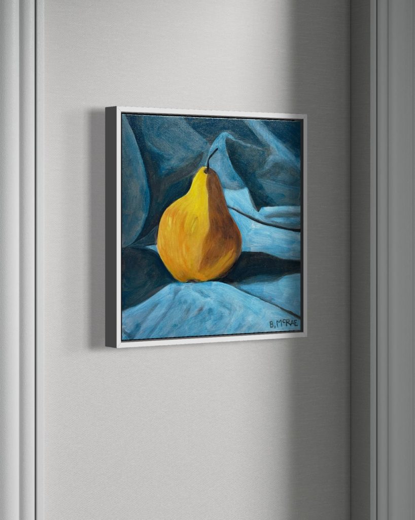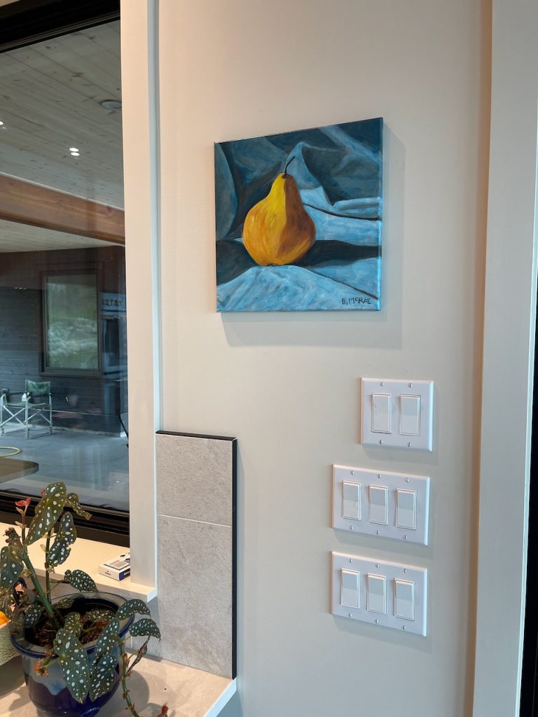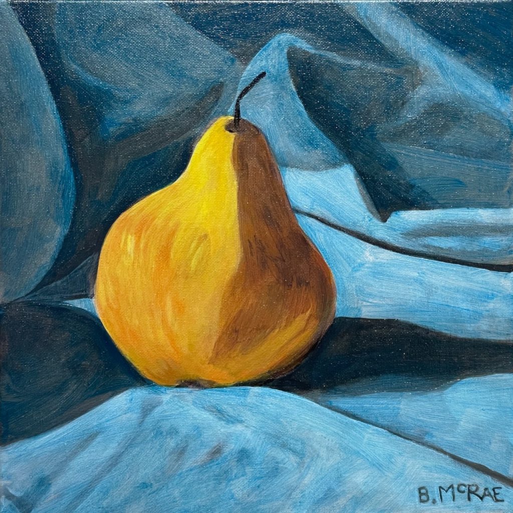 In preparation for my next big painting, I wanted to try a small still life that focussed on shadow and light. For subject matter I chose a simple pear, nestled within a drop cloth. Since there was a strong light source coming in from the left, I was able to create contrast and depth. This was a quick painting, so I didn’t get caught up in a lot of detail (a trap that I’ve fallen into before). Finally, the dominant colours are orange-yellow, and a sort of green-blue. I chose these colours because I wanted the pear to pop out in contrast to the blue background and let the yellow and orange dominate. It now sits on our kitchen wall close to the sliding doors. A spot that gets a regular rotation of 12”x12” paintings.
