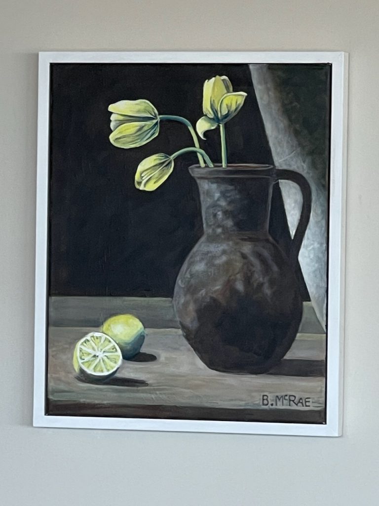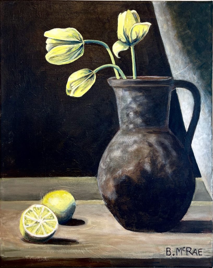 I wanted this still life to be a meditation on light and shadow. Where cast shadows created shapes and reflecting light told its own story. The tulips reminded me of simple notes on a musical score, and I used the idea of music to inform me while painting. Although a still life is static by nature, I wanted this painting to sing.