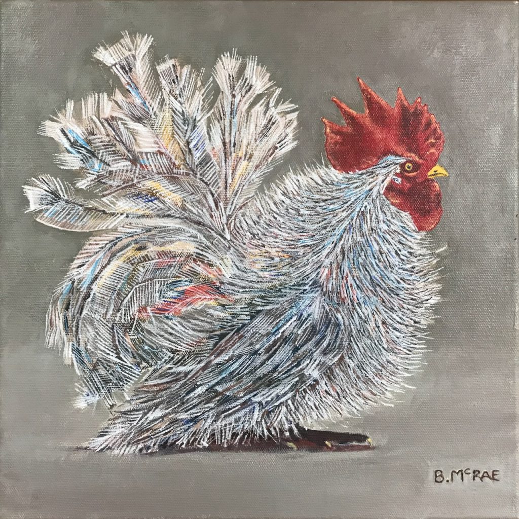 There was always one chicken in the barnyard that was lowest on the pecking order. The poor bird had a constantly harried look about it. Feathers were disarranged and the hen was clearly stressed. Unfortunately, the nature of chickens is to establish a pecking order, so there was always going to be one at the bottom. Although the reference photo was of a prize bird that naturally had fluffed out feathers, I kept thinking about the lowest hen while I was painting.